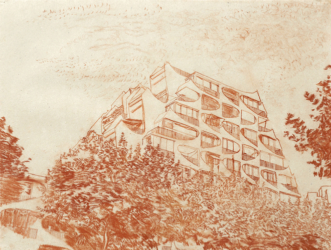 En choisissant la sanguine, Cyril Duret travaille littéralement avec la pierre. Cette pierre naturelle rouge, utilisée dès la préhistoire pour le dessin pariétal et qui connaît un essor au XVIIIᵉ siècle, porte en elle une temporalité longue, presque géologique. Par sa texture et sa couleur, elle incarne une chaleur organique. Cyril Duret s’empare de cette matière ancienne pour la confronter à des motifs d’architectures contemporaines, d’espaces construits qui se mêlent à la végétation.
